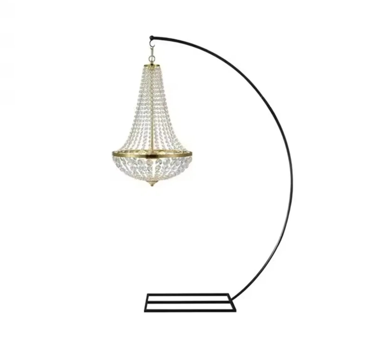 Add a touch of luxury to your event with this classic crystal chandelier, beautifully suspended from a modern freestanding arch stand available in gold or black. This eye-catching piece is perfect for ceremonies, sweetheart tables, lounges, or statement photo moments — no ceiling rigging required.