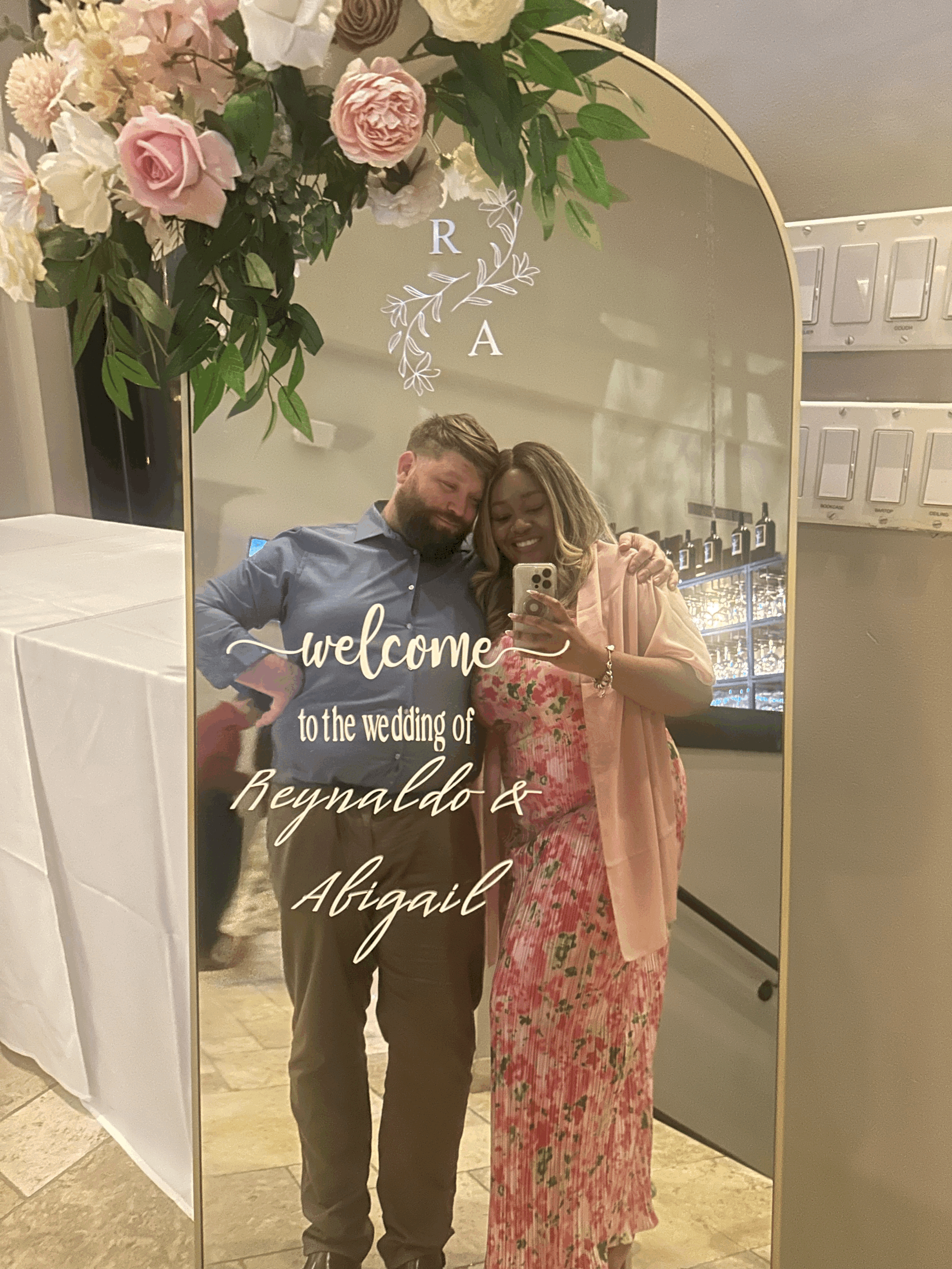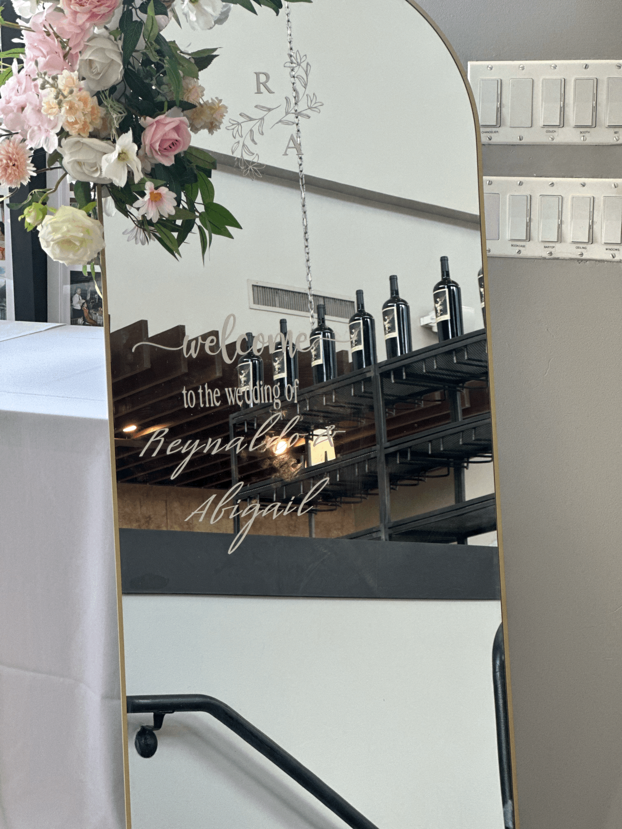 Make a stunning first impression with our elegant mirrored sign, perfect for welcoming guests, displaying seating charts, signature drinks, or custom quotes. This luxe mirror features a sleek frame and fully customizable vinyl text to match your event’s style and theme.